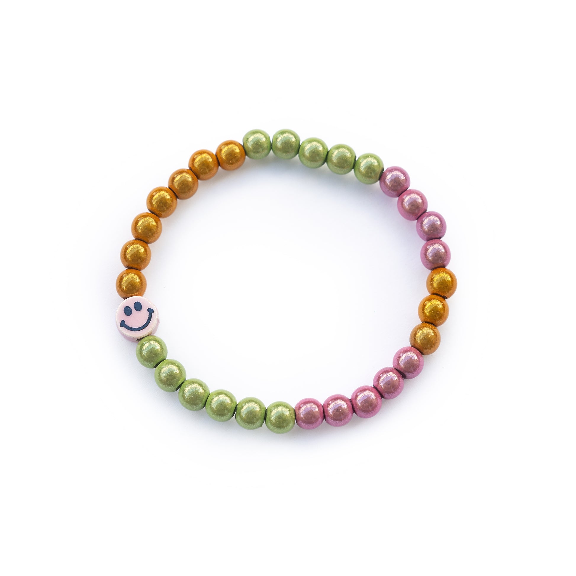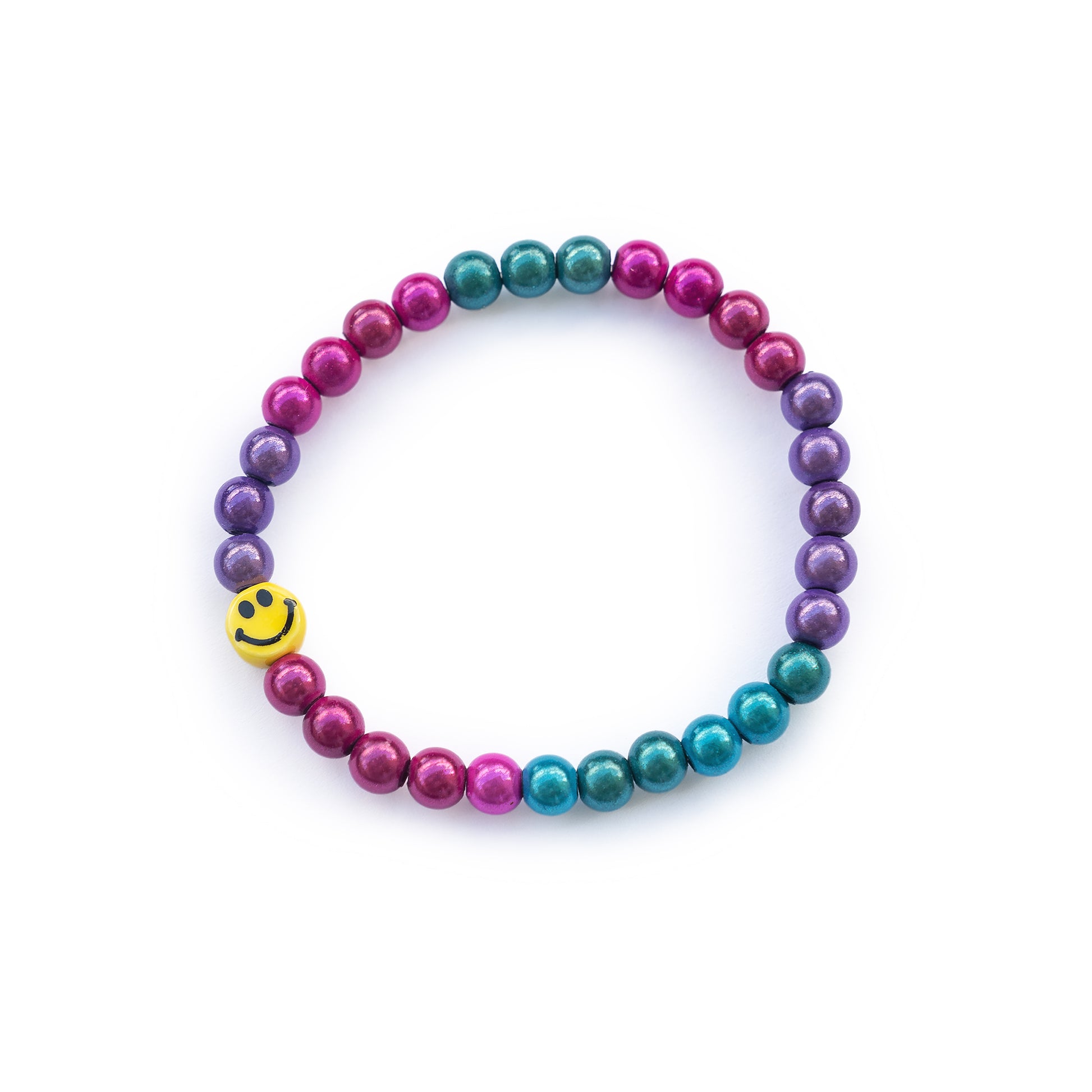 Ein schimmerndes Armband aus Acrylperlen mit 3D Effekt. Es gibt verschiedene Perlenfarben, aus denen du dein Armband zusammenstellen kannst. Die Perlen sind 6mm groß und als Eyecatcher gibt`s einen Smiley aus Keramik.