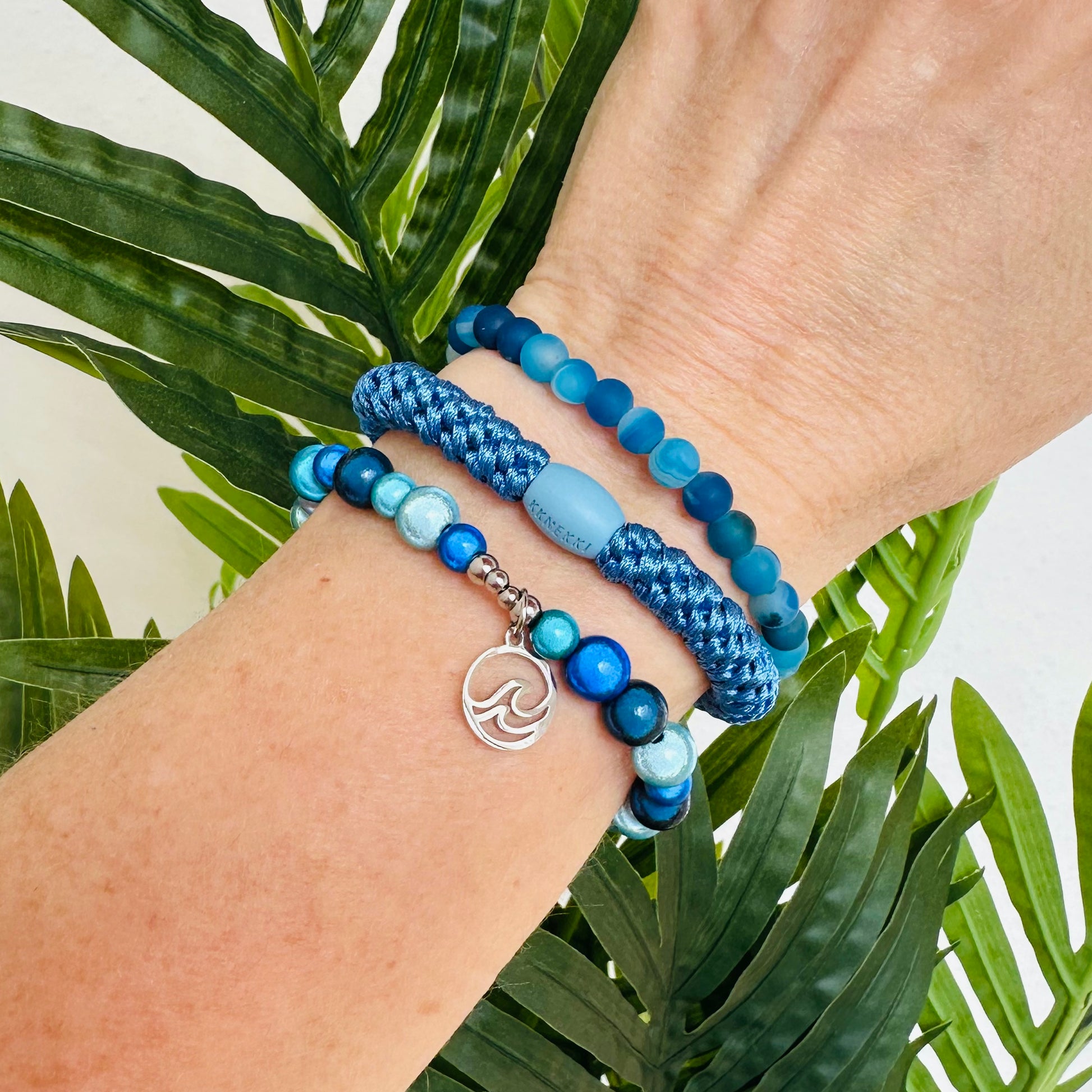 - 1x Armband aus 3D Shiny-Beads (6/8mm) in Blau-Tönen mit Edelstahlperlchen und Wellen-Anhänger aus Edelstahl