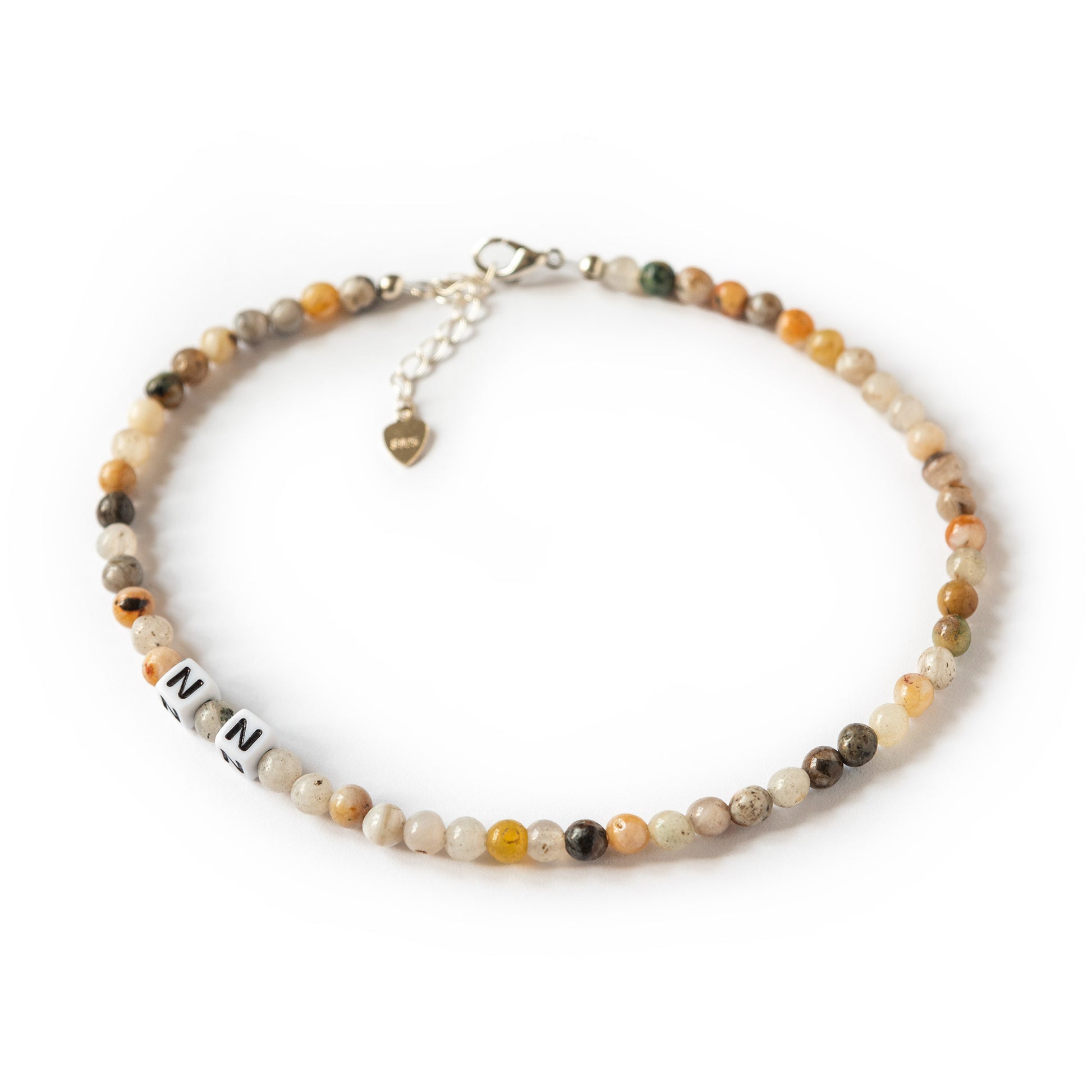 Ich bin ein Fußkettchen und bestehe aus zauberhaften Natursteinperlen und deinem Wunschtext. Sowohl bei den Perlen, als auch bei den Buchstaben kannst du aus verschiedenen Varianten wählen und dir so dein ganz persönliches Unikat zusammenstellen. Durch ein kleines Edelstahlkettchen bin ich um 5cm größenverstellbar.