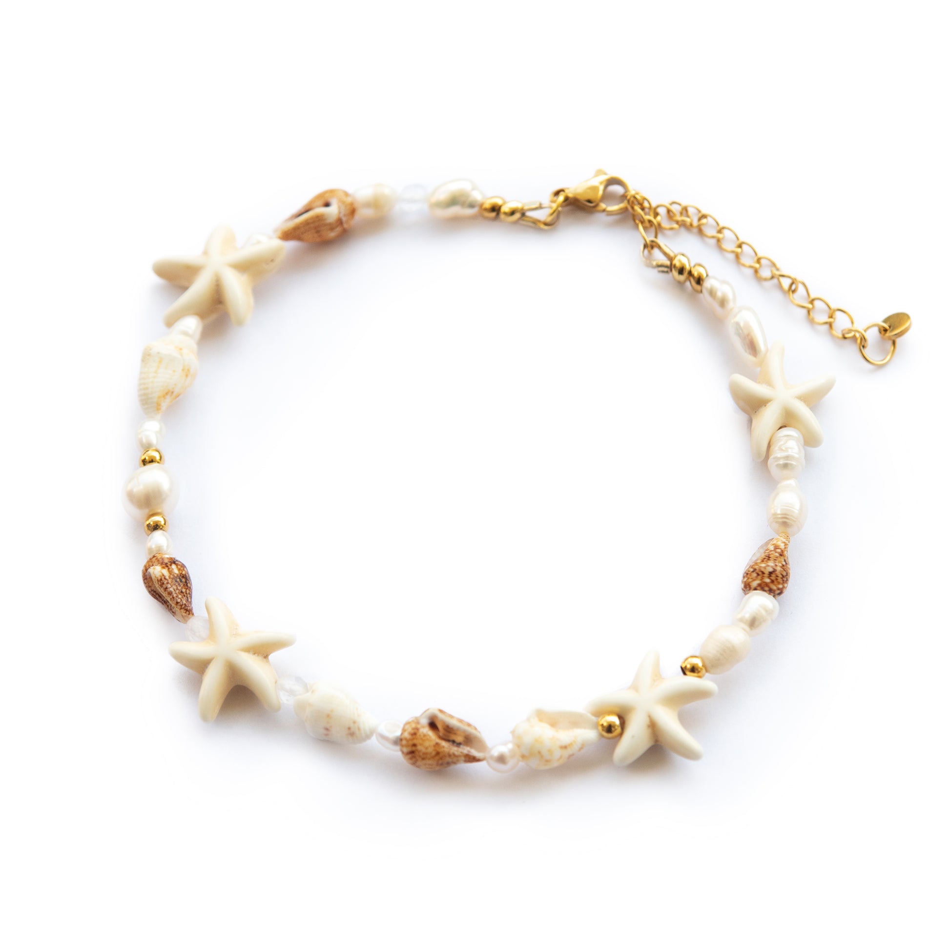 Ich bin ein hübsches Fußkettchen und bestehe aus Süßwasserperlen, Muschelperlen, Seesternen (aus Keramik) und kleinen Natursteinperlen. Abgerundet wird das ganze mit kleinen Edelstahlperlchen, der Verschluss ist ebenfalls aus Edelstahl.