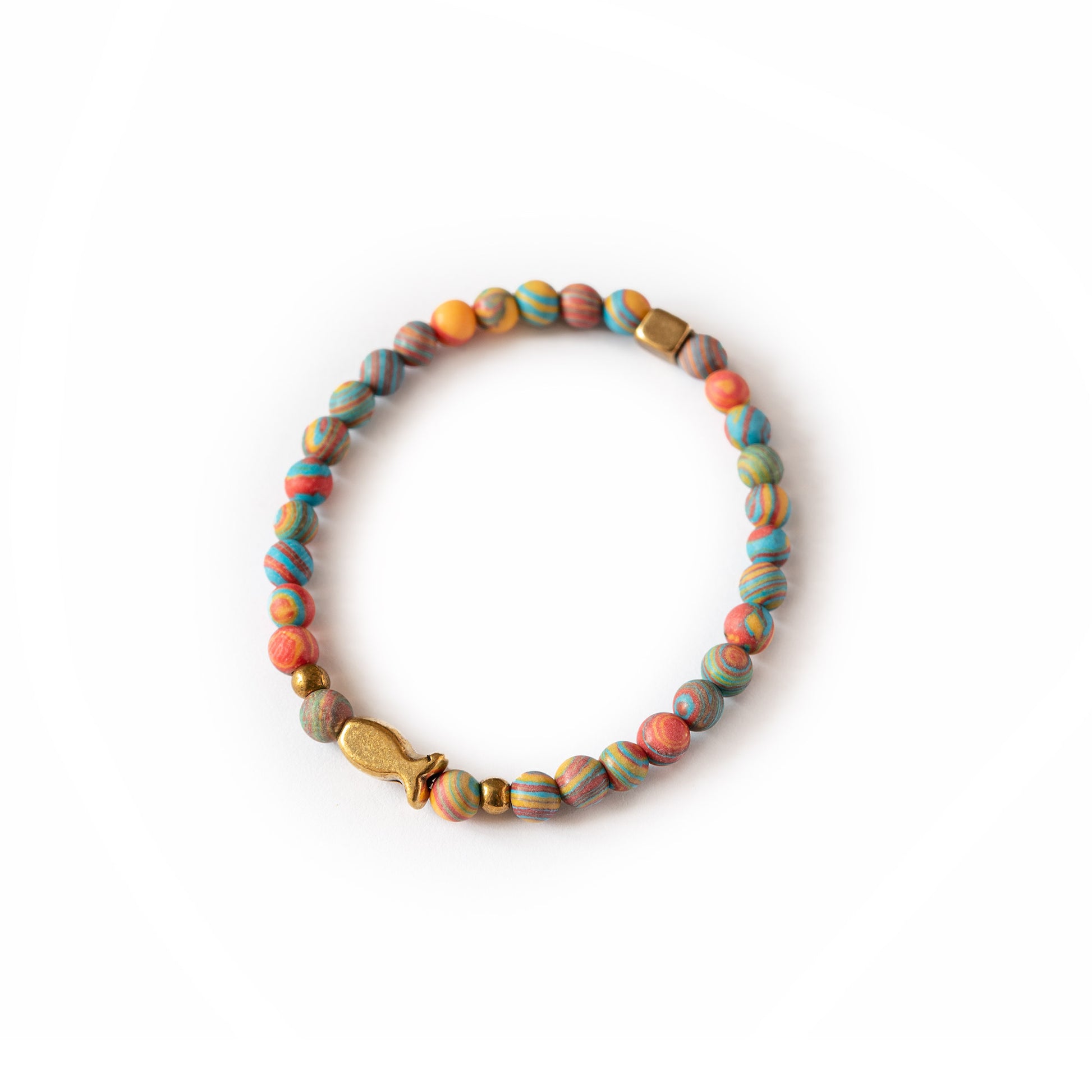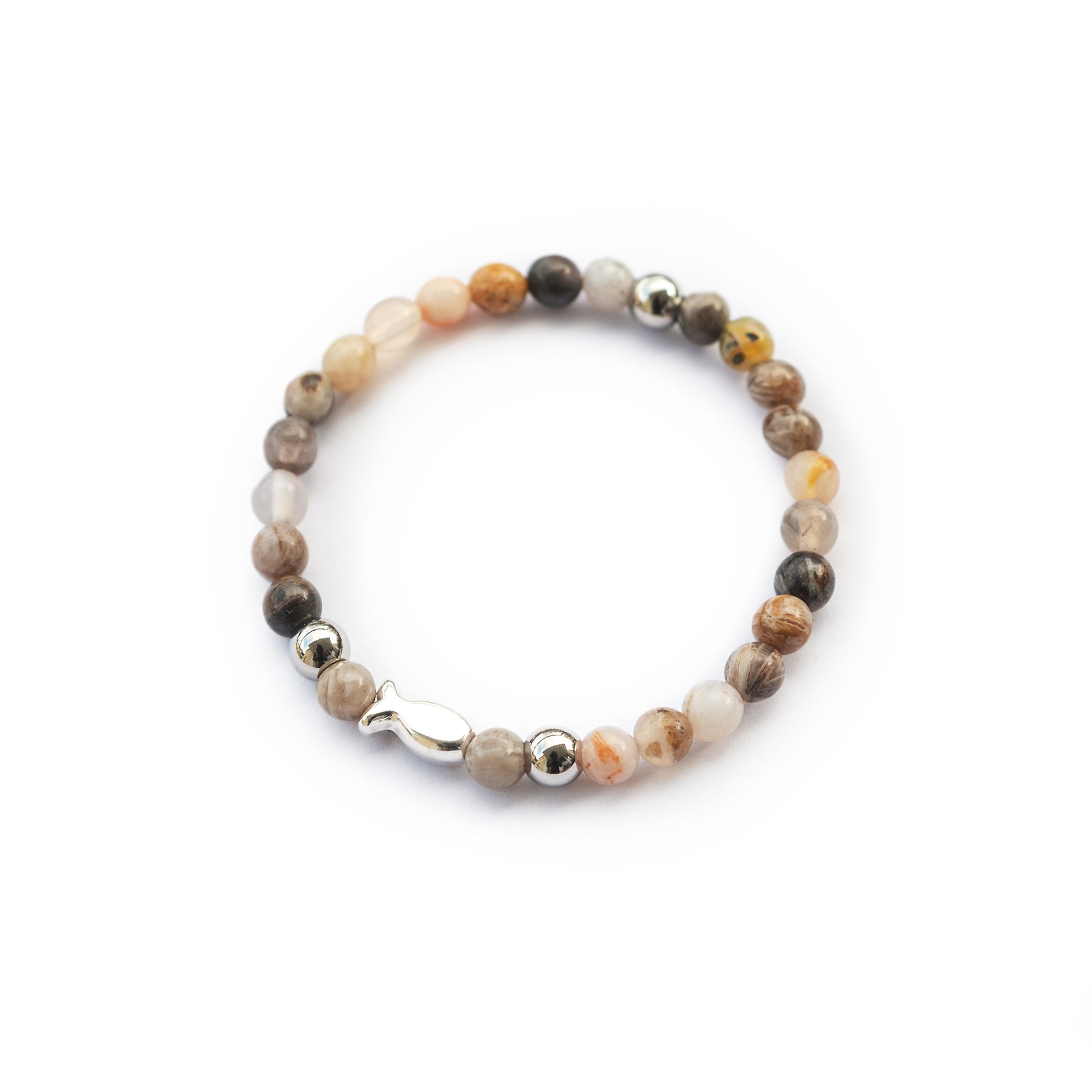 und mit einem Fisch-Symbol in silber oder bronze. Bei den Perlen kannst du zwischen verschiedenen Steinperlenvarianten wählen.