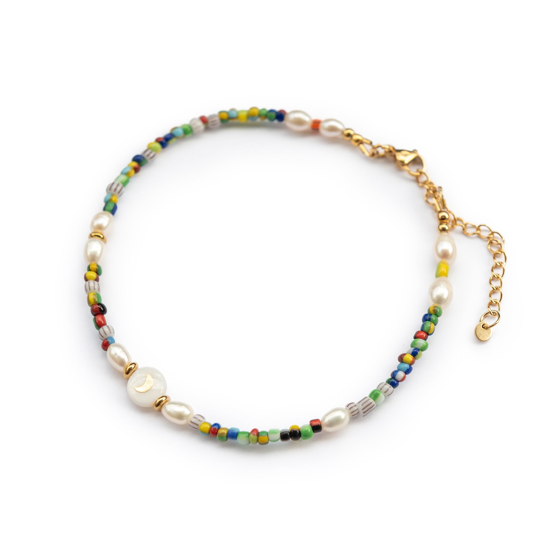 Ich bin ein wunderschönes Fußkettchen aus bunten Glasperlen und Süßwasserperlen. Als Highlight ist eine permuttfarbene Muschelperle mit deinem Wunschmotiv eingesetzt. Natürlich können auf Wunsch auch Buchstaben eingearbeitet werden.