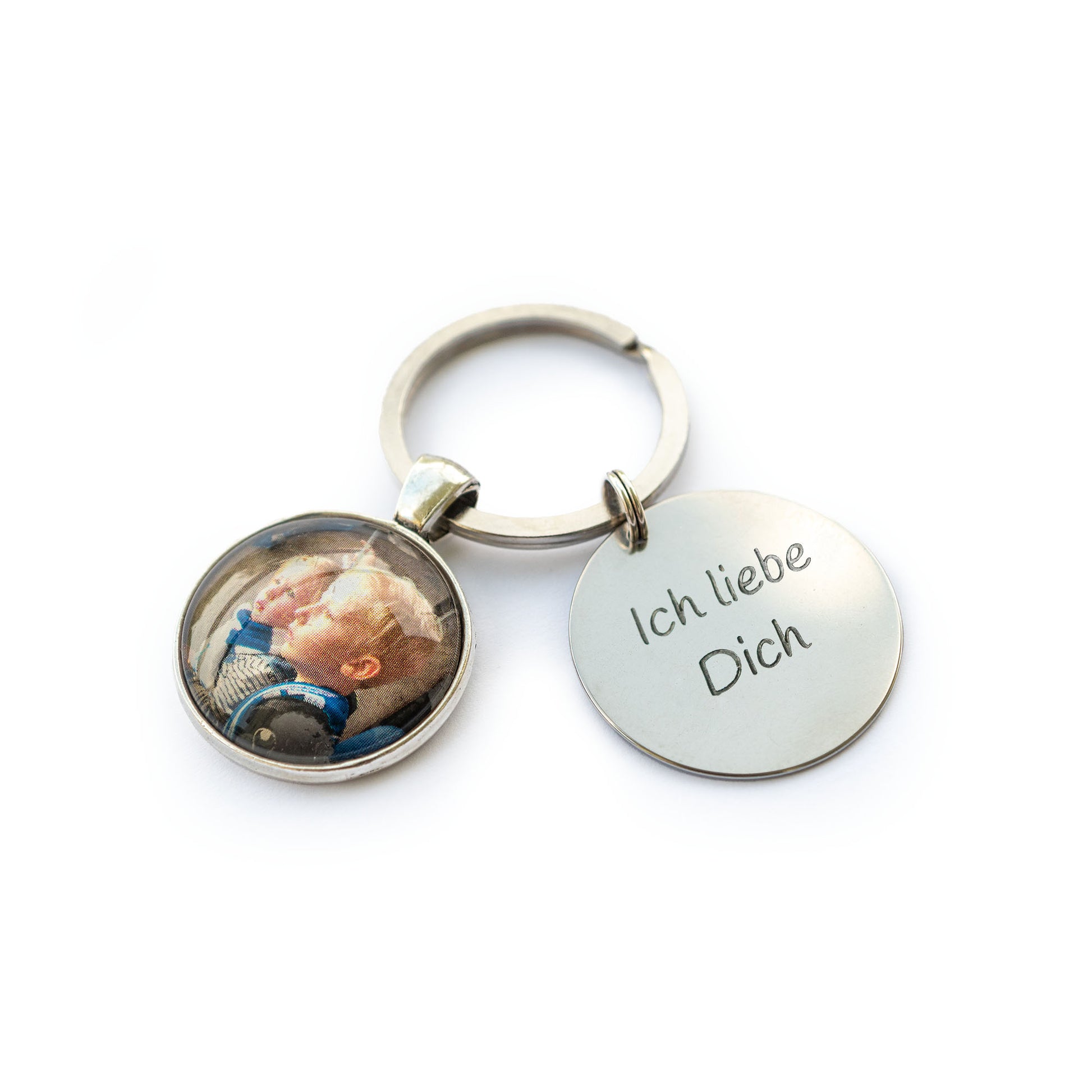Ich bin ein Schlüsselanhänger aus Edelstahl in den dein Wunschtext graviert wird. Dazu gibt es einen Metallanhänger mit DEINEM Lieblingsfoto , das kannst du im Bestellvorgang einfach hochladen.