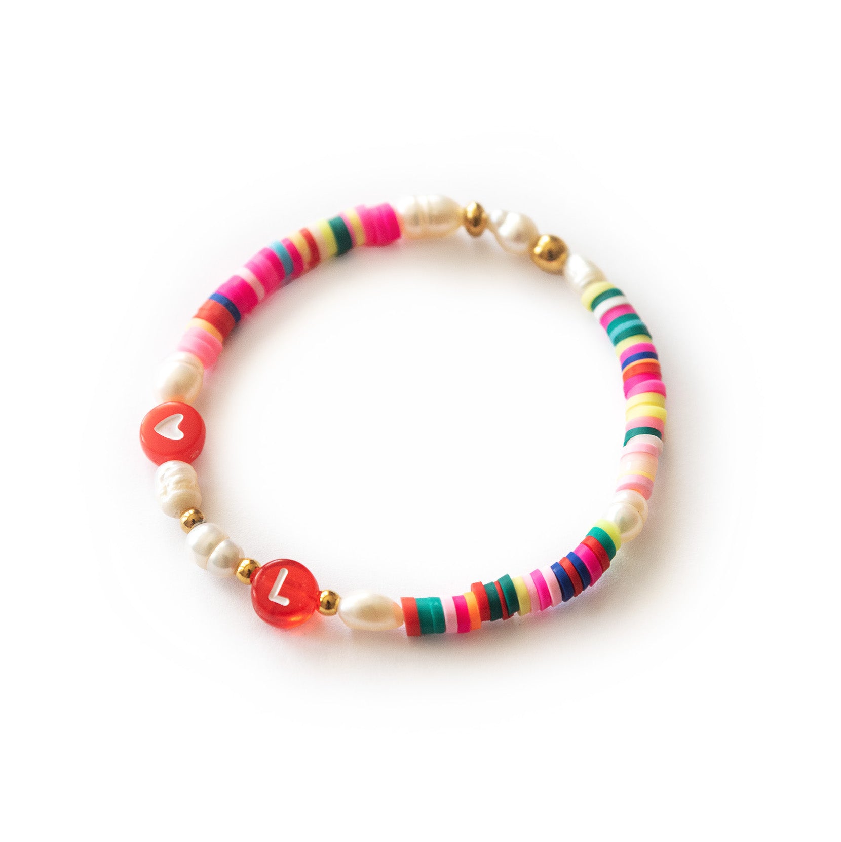 Ich bin ein kunterbuntes Armband und bestehe aus Polymer und Süsswasserperlen. Hier kannst du aus vielen, bunten Varianten wählen. Dazu werden deine Wunschbuchstaben und ein Herz in deiner Wunschfarbe integriert. Das Armband ist elastisch.