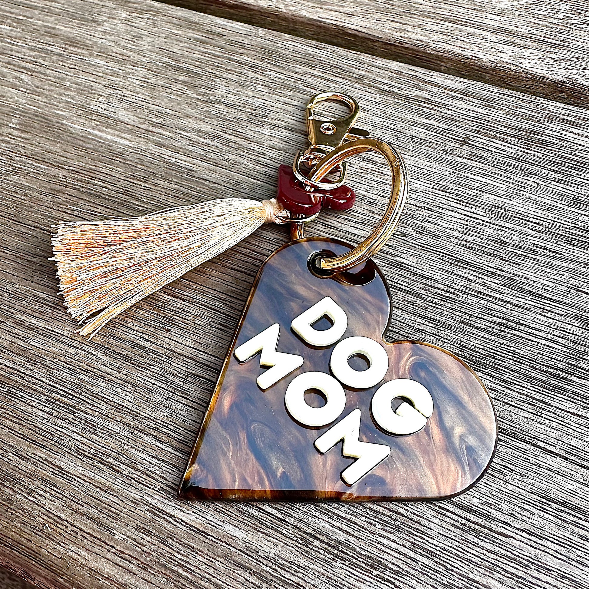 Variante: Herz in braun-marmoriert, Schriftzug DOG MOM in creme-weiß, Quaste in peach, kleines Herz in bordeaux.