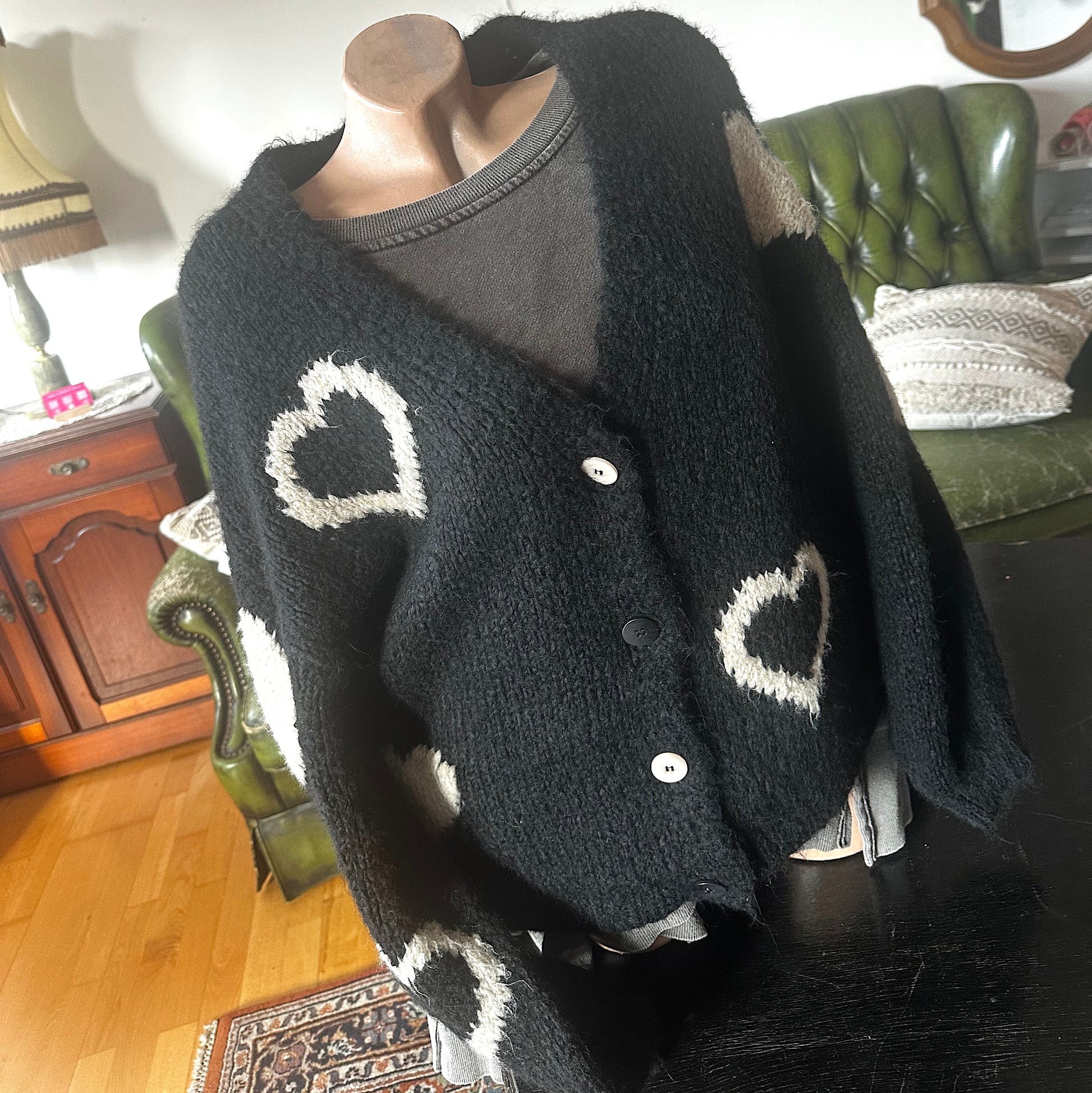 Der schwarze Cardigan besteht aus weichem, kuscheligem Material und ist mit süßen, kontrastfarbenen Herz-Details verziert – ein echter Hingucker für kühle Tage.
