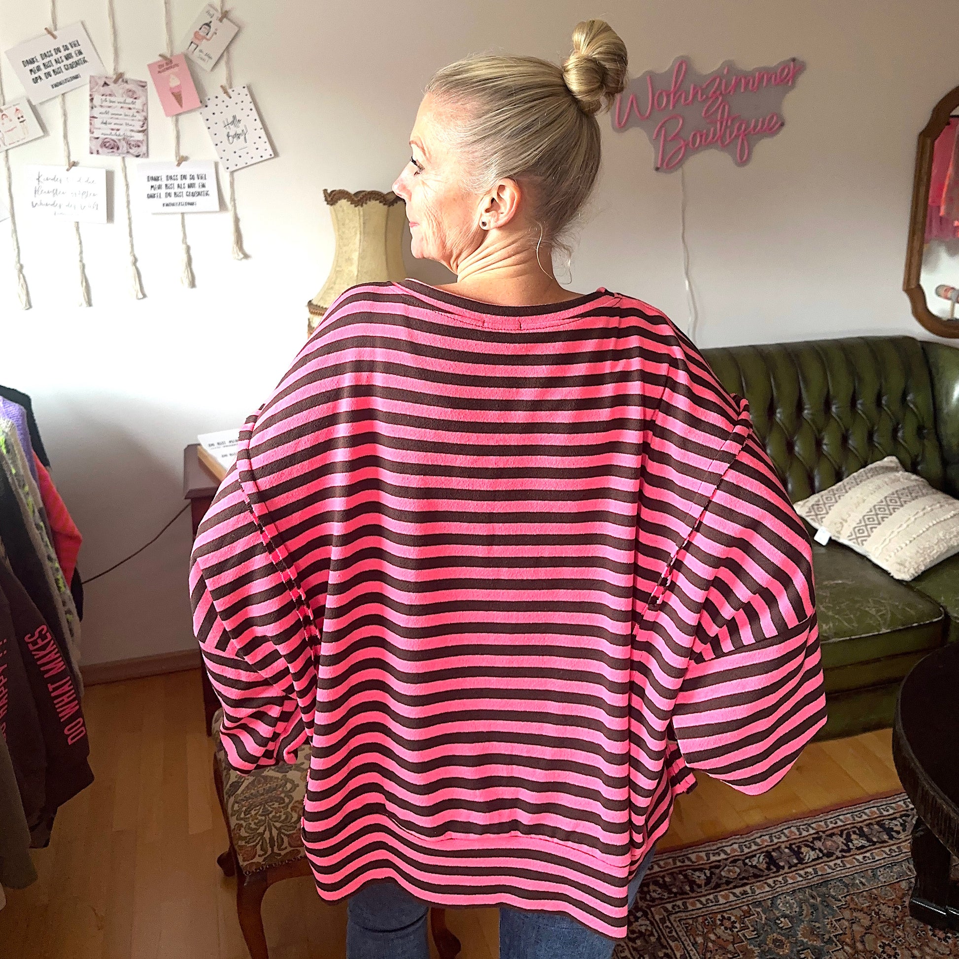 Leichter, weicher Sweater, pink/schwarz gestreift und als Hingucker der LOVE-Flock mit glitzernder Umrandung. One-Size (passt 36-46/48). Lockerer Schnitt, runder Halsausschnitt, oversize geschnitten, hinten länger als vorne, Schlitze an den Seiten.